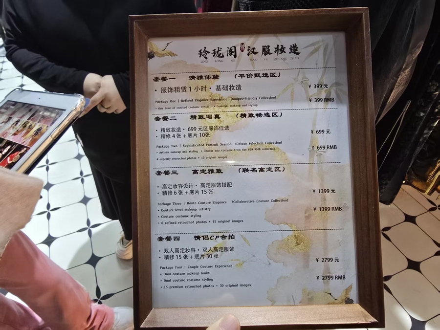 玲珑阁旅拍的双语价目表。文报告记者 周辰 摄