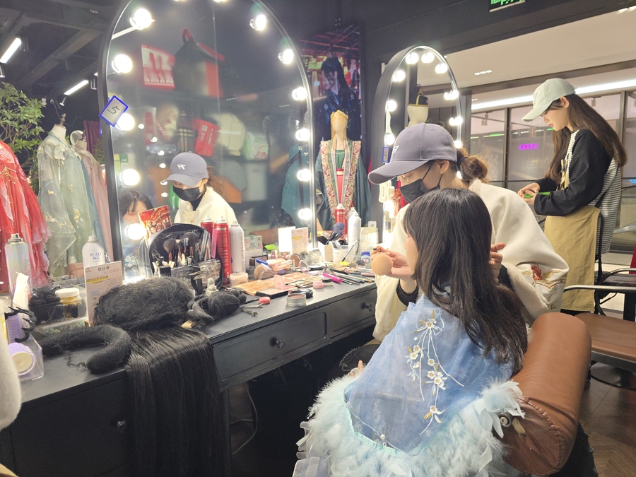 百合旅拍店内,一位来自印尼的小女孩正在作念汉服妆造。文报告记者 周辰 摄