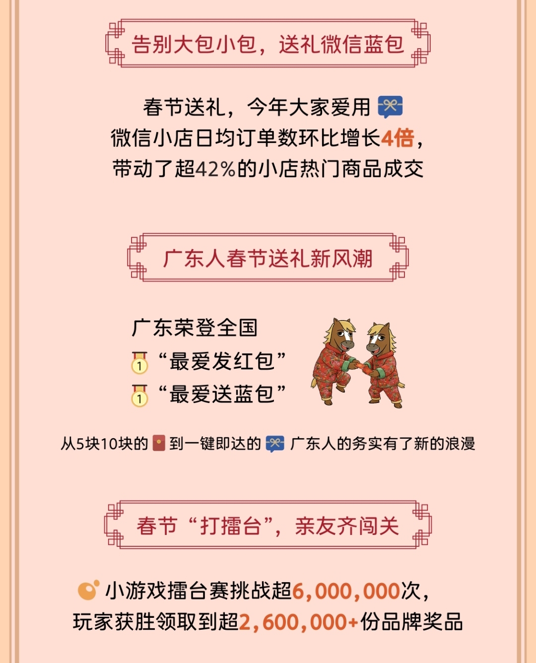 比拟于传统的大包小包,微信蓝包正在成为网民意思的春节耸峙神色。这种“节前送异乡味,节后带家乡情”的细微流动,带动微信小店日均耸峙订单数环比加多4倍。其中,广东同期登顶宇宙“最爱发红包”和“最爱送蓝包”省份。