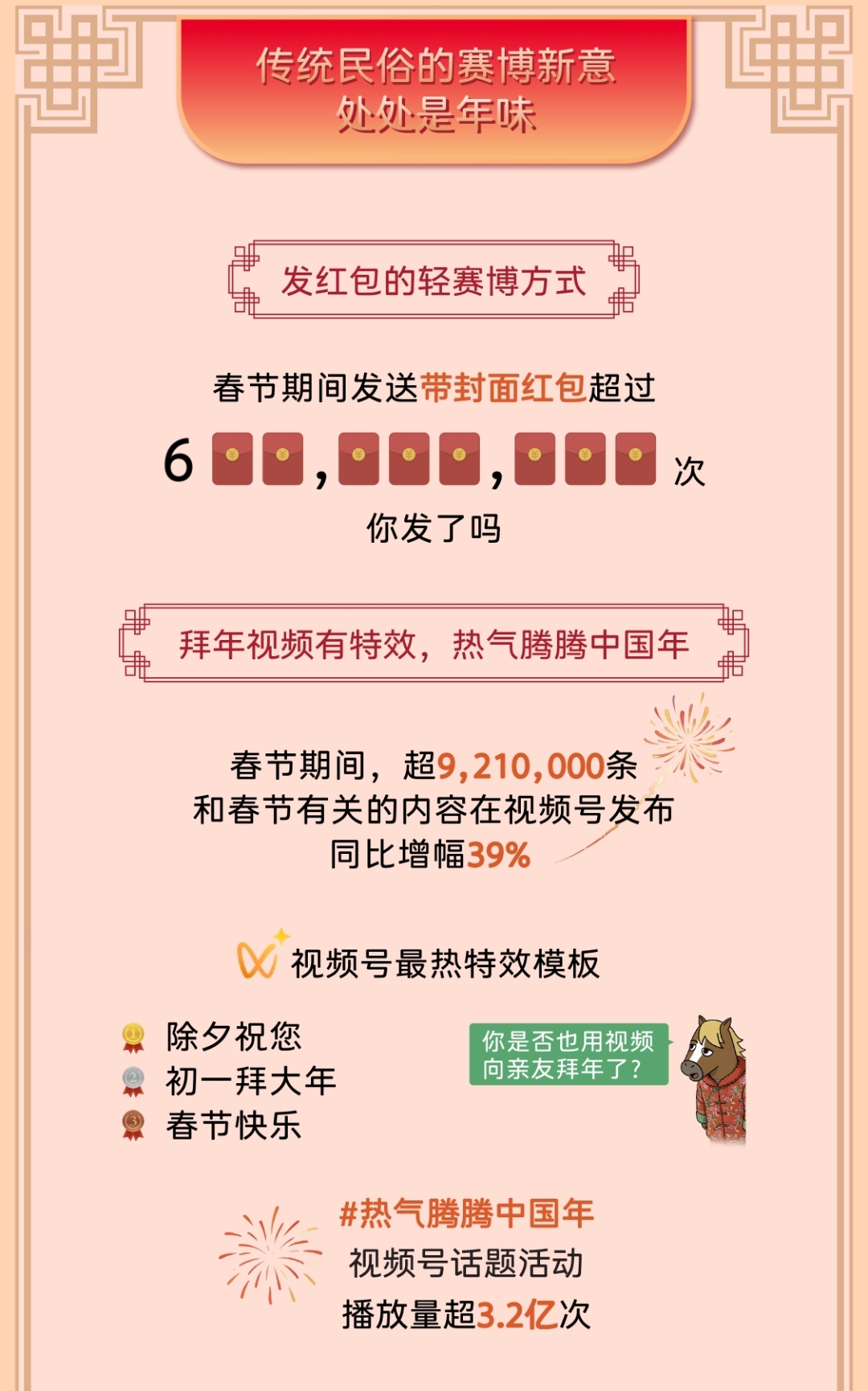 时期不仅拉近了距离,更重构了年味。春节时间,微信用户发送带封面红包超6亿次。除了贺年红包、贺年一又友圈外,用户也热衷于用贺年短视频传递年味。数据表露,春节时间,近千万条和春节关联的实际在视频号发布,同比增幅39%。